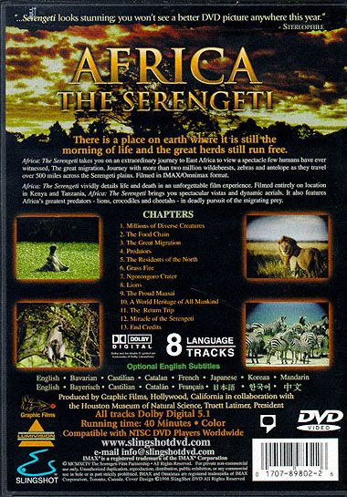 In “Africa: the Serengeti” viewers are given a dispassionate glimpse at the interrelated lives of beast and prey. Narrated by James Earl Jones, the story tries to tie together the lives of a herd of wildebeest and their nemesis, lions. Constantly under the possibility of attack by the teams of lionesses, the wildebeest must endure by constant migration. Along the way, they can meet their demise by alligators along the river, or even the more brutal cheetah that may single out the very old or the very young or the sickly. The tale reveals all the ancillary carnivores that feed off the leavings, like the plain vulture, which will clean the bones after lions feed. Even the tribal Africans have had their connections to the wildebeest in history, as a brief lesson shows. Today the modern Serengeti visitor may do it in an air balloon. Whatever way the animals are watched, their lives remain timeless, with constant battles and traditional elements, in their journey to survive.