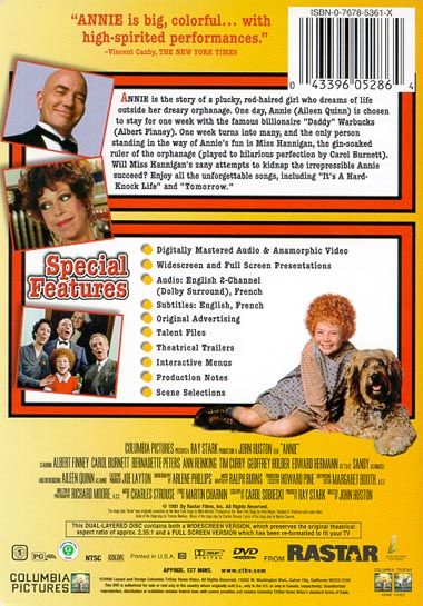 Annie (Aileen Quinn) is an orphan who lives in the orphanage under the direction of the cruel, alcoholic Miss Hannigan (Carol Burnett). Annie has a locket given to her by her parents, so she runs away to find them only to be caught and returned. Upon her return Grace Farrell (Anne Reinking), secretary to the wealthy Daddy Warbucks (Albert Finney) chooses her to go stay with Daddy Warbucks. After the trial visit, Daddy Warbucks decides to adopt Annie. To make her happy, he offers a $50,000 reward for information about her real parents. Miss Hannigan, in cahoots with her crooked brother, Rooster (Tim Curry) and his girlfriend, Lily (Bernadette Peters), claims Annie and demands the reward. After forcing Annie to go with her 'real parents' the news reaches Daddy Warbucks that Annie's real parents died, and he knows the people who took her are frauds and up to no good. Daddy Warbucks and company goes all out to find Annie. Annie, who has realized that Miss Hannigan is part of the plot, goes through many scary times. Finally Punjab (Geoffrey Holder), Daddy Warbuck’s right hand man, snatches Annie from a very precarious situation.