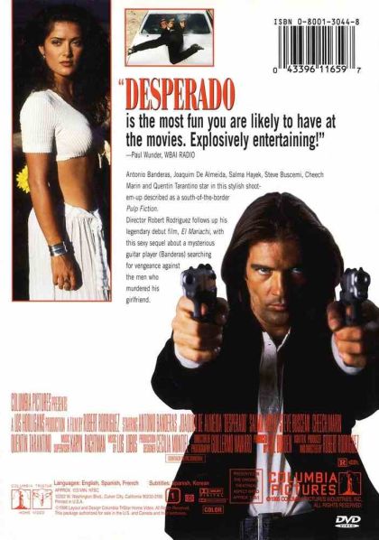 "Desperado" continues the story of a musician with a mission. This time around the story finds our hero with a sore hand and a dead girlfriend. Looking for work, this marauding musician (Antonio Banderas) stumbles into a case of mistaken identity and must fight his way out. Along the way he meets a beautiful woman (Salma Hayek) and takes revenge on the local drug lord, personally showing him his guitar full of dirty tricks. Loosely based on the Westerns of years before, "Desperado" succeeds greatly at telling an entertaining story with little fluff and lots of good times.