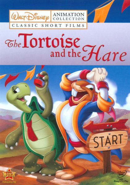 In Walt Disney’s animated version of Aesop’s classic fable The Tortoise and the Hare, the race between the woodland creatures becomes updated as a modern athletic tale. With crowds of other creatures from the forest sitting in the stands, the arrogant and star athlete Hare, complete with college sweater, feels such a race is beneath his dignity and requires little or no effort for victory. The Tortoise resembles a country bumpkin on whom practical jokes are lost because of his pleasant and affable mentality. Along the way the rabbit stops to impress young lady rabbits with his skills in tennis, archery, and baseball. Of course, his delays and personal foibles lead to the plodding turtle to prove the adage about Slow and Steady.