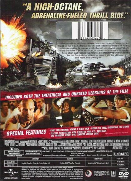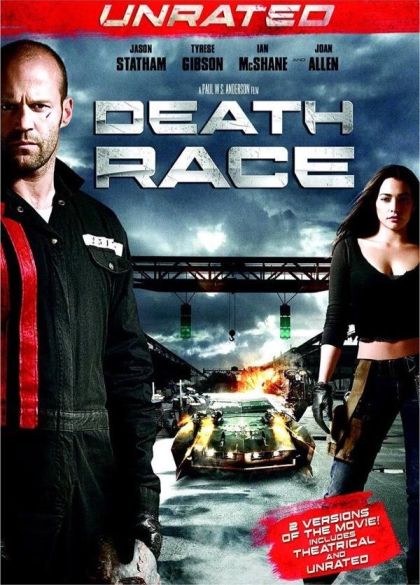 Deathrace is an action thriller which is set in a future in which prisons are moneymaking entities run by corporations. Jensen Ames (Jason Statham) is a former race car driver who is wrongfully convicted of murder and imprisoned. In the world of Deathrace, a prisoner can earn his freedom if he wins five no-holds-barred lethal car races. Warden Hennessey (Joan Allen) is the evil prison director who is determined to profit from the televised mayhem. One of the most popular drivers is the masked Frankenstein. Frankenstein has died, but the warden wants Jensen to pose as Frankenstein for one last deadly race. She promises that Jensen will be freed if he wins the race. Jensen is aided in this cause by his head mechanic “Coach” (Ian McShane), who helps to build the armed and armored killing machine of a vehicle.