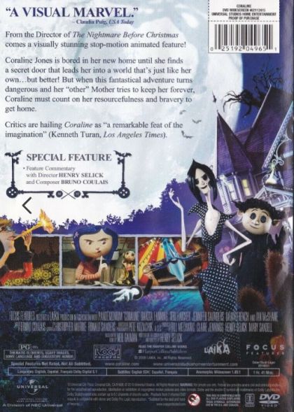 Wandering her rambling old house in her boring new town, 11-year-old Coraline discovers a hidden door to a strangely idealized version of her life. In order to stay in the fantasy, she must make a frighteningly real sacrifice.