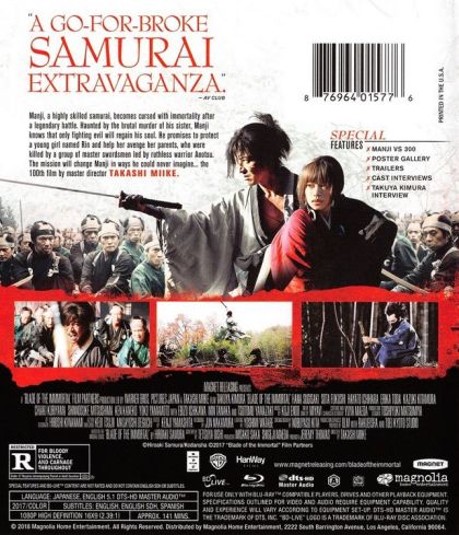 Manji, a highly skilled samurai, becomes cursed with immortality after a legendary battle. Haunted by the brutal murder of his sister, Manji knows that only fighting evil will regain his soul. He promises to help a young girl named Rin avenge her parents, who were killed by a group of master swordsmen led by ruthless warrior Anotsu.