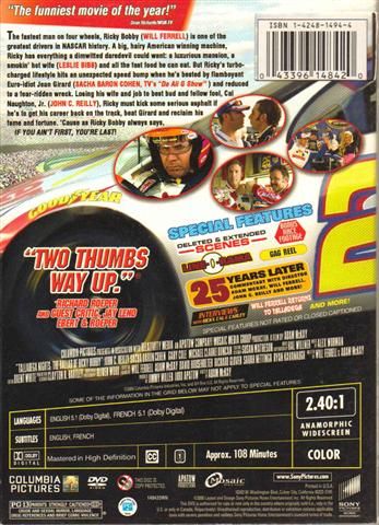 The fastest man on four wheels, Ricky Bobby, is one of the greatest drivers in NASCAR history. A big, hairy American winning machine, Ricky has everything a dimwitted daredevil could want, a luxurious mansion, a smokin' hot wife, and all the fast food he can eat. But Ricky's turbo-charged lifestyle hits an unexpected speed bump when he's bested by flamboyant Euro-idiot Jean Girard and reduced to a fear-ridden wreck.
