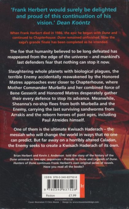 "At the end of Frank Herbert's final novel, Chapterhouse: Dune, a ship carrying a crew of refugees escapes into the uncharted galaxy, fleeing from a terrifying, mysterious Enemy. The fugitives used genetic technology to revive key figures from Dune's past - including Paul Muad'Dib and Lady Jessica - to use their special talents to meet the challenges thrown at them. Based directly on Frank Herbert's final outline, which lay hidden in two safe-deposit boxes for a decade, Sandworms of Dune will answer the urgent questions Dune fans have been debating for two decades: the origin of the Honored Matres, the tantalizing future of the planet Arrakis, the final revelation of the Kwisatz Haderach, and the resolution to the war between Man and Machine."--