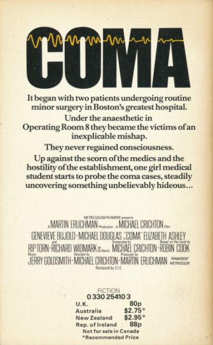 The blockbuster bestseller that kickstarted a new genre--the medical thriller--is now available in trade paperback for the first time.They called it "minor surgery," but Nancy Greenly, Sean Berman and a dozen others--all admitted to Boston Memorial Hospital for routine procedures--were victims of the same inexplicable, hideous tragedy on the operating table. They never woke up.Susan Wheeler is a third-year medical student working as a trainee at Boston Memorial Hospital. Two patients during her residency mysteriously go into comas immediately after their operations due to complications from anesthesia. Susan begins to investigate the causes behind both of these alarming comas and discovers the oxygen line in Operating Room 8 has been tampered with to induce carbon monoxide poisoning. Then Susan discovers the evil nature of the Jefferson Institute, an intensive care facility where patients are suspended from the ceiling and kept alive until they can be harvested for healthy organs. Is she a participant in--or a victim of--a large-scale black market dealing in human organs?