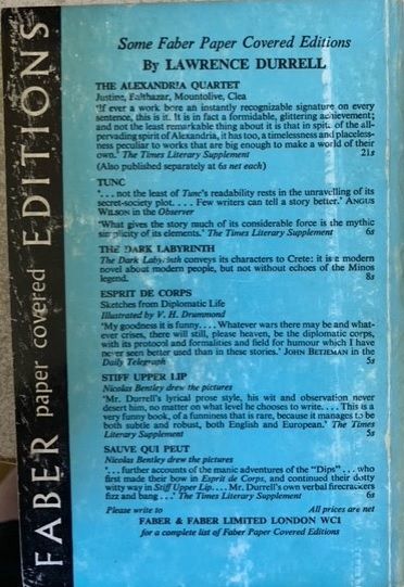 1975 Faber and Faber trade paperback, LAWRENCE DURRELL (Justine). Years after his liaisons with Justine and Melissa, Darley becomes immersed in a relationship with Clea, a bisexual artist. The ensuing chain of events transforms not only the lovers, but the dead as well, and leads to the series’ brilliant and unexpected resolution.