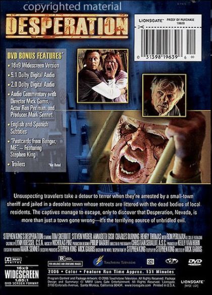Baseado na Obra "Desespero" de Stephen King A caminho do Lago Tahoe por ansiadas férias, a família Carver se vê presa ao ter os pneus de seu trailer furados, Collie Entragian é o xerife da pequena cidade de Desperation, Nevada, e um policial cuja maldade transcende sua vida. Mas os Cavers não estão sozinhos. Entragian tem o péssimo hábito de, regulamente, deter os viajantes na estrada que corta a cidade de Desperation e cuja população, na verdade, foi formada a partir do seu arbítrio. O xerife também pode mudar de forma e convocar criaturas horripilantes, incluindo escorpiões, cobras e aranhas.