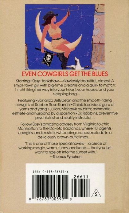 Starring Sissy Hanshaw--flawlessly beautiful, almost. A small-town girl with big-time dreams and a quirk to match--hitchhiking her way into your heart, your hopes, and your sleeping bags... Featuring Bonanza Jellybean and the smooth-riding cowgirls of Rubber Rose Ranch. Chink, lascivious guru of yams and yang. Julian, Mohawk by birth; asthmatic esthete and husband by disposition. Dr. Robbins, preventive psychiatrist and reality instructor... Follow Sissy's amazing odyssey from Virginia to chic Manhattan to the Dakota Badlands, where FBI agents, cowgirls, and ecstatic whooping cranes explode in a deliciously drawn-out climax... From the Trade Paperback edition.