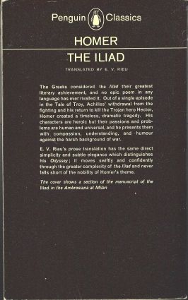 The Greeks considered the 'Iliad' their greatest literary achievement, and no epic poem in any language has ever rivalled it. Out of a single episode in the Tale of Troy, Achilles' withdrawal from the fighting and his return to kill the Trojan hero Hector, Homer created a timeless, dramatic tragedy. His characters are heroic but their passions and problems are human and universal, and he presents them with compassion, understanding, and humour against the harsh background of war. E V Rieu's prose translation has the same direct simplicity and subtle elegance which distinguishes his 'Odyssey'; it moves swiftly and confidently through the greater complexity of the 'Iliad' and never falls short of the nobility of Homer's theme.