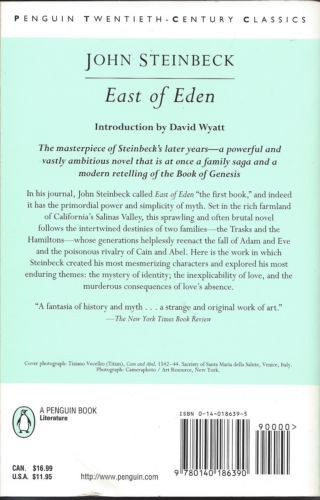 A masterpiece of Biblical scope, and the magnum opus of one of America’s most enduring authorsA Penguin ClassicIn his journal, Nobel Prize winner John Steinbeck called East of Eden “the first book,” and indeed it has the primordial power and simplicity of myth. Set in the rich farmland of California’s Salinas Valley, this sprawling and often brutal novel follows the intertwined destinies of two families—the Trasks and the Hamiltons—whose generations helplessly reenact the fall of Adam and Eve and the poisonous rivalry of Cain and Abel.The masterpiece of Steinbeck’s later years, East of Eden is a work in which Steinbeck created his most mesmerizing characters and explored his most enduring themes: the mystery of identity, the inexplicability of love, and the murderous consequences of love's absence. Adapted for the 1955 film directed by Elia Kazan introducing James Dean and read by thousands as the book that brought Oprah’s Book Club back, East of Eden has remained vitally present in American culture for over half a century.This edition features an introduction by David Wyatt.For more than seventy years, Penguin has been the leading publisher of classic literature in the English-speaking world. With more than 1,800 titles, Penguin Classics represents a global bookshelf of the best works throughout history and across genres and disciplines. Readers trust the series to provide authoritative texts enhanced by introductions and notes by distinguished scholars and contemporary authors, as well as up-to-date translations by award-winning translators.