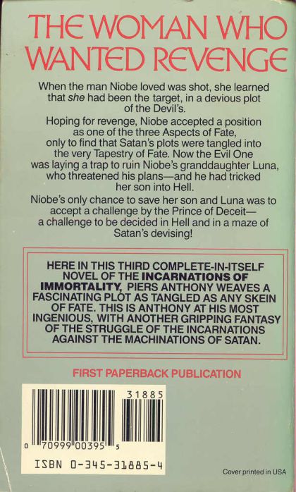 Here in this third complete-in-itself novel of the Incarnations of Immortality, Piers Anthony weaves a fascinating plot as tangled as any skein of fate. This is Anthony at his most ingenious, with another gripping fantasy of the struggle of the incarnations against the machinations of Satan.When the man Niobe loved was shot, she learned that she had been the target, in a devious plot of the Devil's. Hoping for revenge. Niobe accepted a position as one of the three Aspects of Fate, only to find that Satan's plots were tangled into the very Tapestry of Fate. Now the Evil One was laying a trap to ruin Niobe's granddaughter Luna, who threatened his plans—and he had tricked her son into Hell.Niobe's only chance to save her son and Luna was to accept a challenge by the Prince of Deceit—a challenge to be decided in Hell and in a maze of Satan's devising!