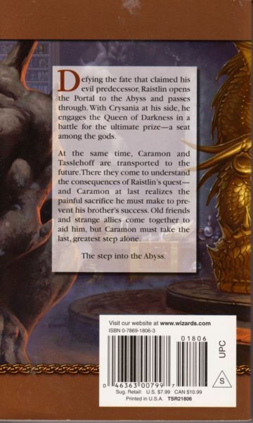 A confrontation with the Queen of Darkness is finally within Raistlin's reach--and Caramon will do anything to stop it--in this conclusion to the beloved Legends trilogy Defying the fate that claimed his evil predecessor, Raistlin opens the Portal to the Abyss and passes through. With Crysania at his side, he engages the Queen of Darkness in a battle for the ultimate prize--a seat among the gods. At the same time, Caramon and Tasslehoff are transported to the future. They come to understand the consequences of Raistlin's quest--and Caramon at last realizes the painful sacrifice he must make to prevent his brother's success. Old friends and strange allies come together to aid him, but Caramon must take the last, greatest step alone: the first step into the Abyss.