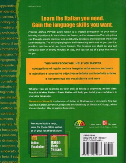 More than 1 million books sold in the Practice Makes Perfect series! Learn Italian in bite-sized lessons! The key to Practice Makes Perfect: Basic Italian is how manageable the grammar and vocabulary are presented to you. You’re not overwhelmed by it all! Supported by engaging exercises, these 50 units cover all aspects of grammar and vocabulary, giving you a solid foundation in the language. Each unit is three pages in length, and you can expect to be completed with each in 10 to 15 minutes. Features Key grammatical concepts and core vocabulary are absorbed almost effortlessly through exercises Flexibility for self-study or as a complement to your first-year class