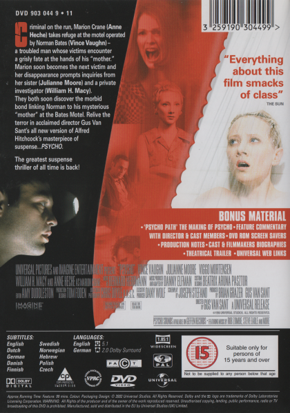 A young female embezzler arrives at the Bates Motel, which has terrible secrets of its own. Although this version is in color, features a different cast, and is set in 1998, it is closer to a shot-for-shot remake than most remakes, Gus Van Sant often copying Hitchcock's camera movements and editing, and Joseph Stefano's script is mostly carried over. Bernard Herrmann's musical score is reused as well, though with a new arrangement by Danny Elfman and recorded in stereo.