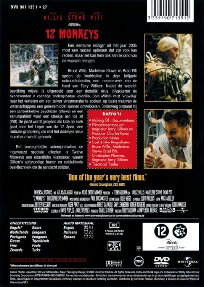 In the year 2035, convict James Cole reluctantly volunteers to be sent back in time to discover the origin of a deadly virus that wiped out nearly all of the earth's population and forced the survivors into underground communities. But when Cole is mistakenly sent to 1990 instead of 1996, he's arrested and locked up in a mental hospital. There he meets psychiatrist Dr. Kathryn Railly, and patient Jeffrey Goines, the son of a famous virus expert, who may hold the key to the mysterious rogue group, the Army of the 12 Monkeys, thought to be responsible for unleashing the killer disease.