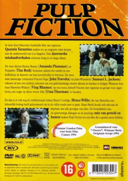 A burger-loving hit man, his philosophical partner, a drug-addled gangster's moll and a washed-up boxer converge in this sprawling, comedic crime caper. Their adventures unfurl in three stories that ingeniously trip back and forth in time.
