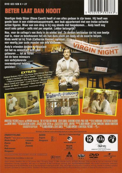 Andy Stitzer has a pleasant life with a nice apartment and a job stamping invoices at an electronics store. But at age 40, there's one thing Andy hasn't done, and it's really bothering his sex-obsessed male co-workers: Andy is still a virgin. Determined to help Andy get laid, the guys make it their mission to de-virginize him. But it all seems hopeless until Andy meets small business owner Trish, a single mom.