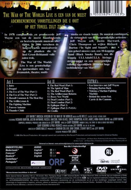In 1978 Jeff Wayne composed and produced one of the most groundbreaking and best-selling musical works of all time. In 2006 after much anticipation Jeff Wayne’s Musical Version of The War of The Worlds was brought to the stage for the first time, playing to sold-out arenas across the UK. The War of The Worlds Live is a spectacular mix of live music, theatre, multi-media and visual arts on a grand scale. It combines the brilliance of the original performers including Jeff Wayne, Justin Hayward, Chris Thompson and even the late Richard Burton (‘In Sight and Sound’) along with a brand new cast, the 10-piece Black Smoke Band, the 48-piece ULLAdubULLA Strings and an unforgettable fully operating 30ft Martian Fighting Machine!