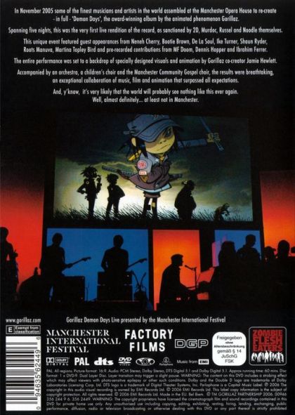 Demon Days: Live at the Manchester Opera House is a Grammy Award nominated live DVD by the Gorillaz, released the 27th of March 2006 in the UK. It compiles the live performances from the 1st of November to the 5th of November 2005 at the Manchester Opera House that recreated the Demon Days Studio album. It was directed by David Barnard and Grant Gee.