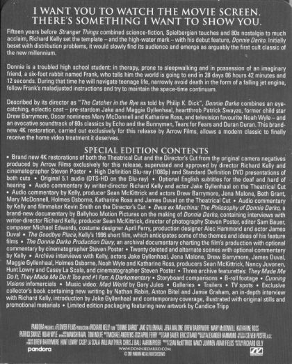 2 oktober 1988, een gewone dag in het leven van de verwarde 16-jarige Donnie Darko. Dan valt er vanuit het niets een vliegtuigmotor door het dak van z'n huis, recht in Donnie's kamer. Gelukkig ligt Donnie niet in bed, aangezien hij hiervoor in een visioen gewaarschuwd is door een 2 meter lang konijn. Terwijl Donnie het leven en de liefde begint te verkennen ontdekt hij de geheimen van het universum waardoor hij de mogelijkheid krijgt om de tijd en zijn lot te veranderen.