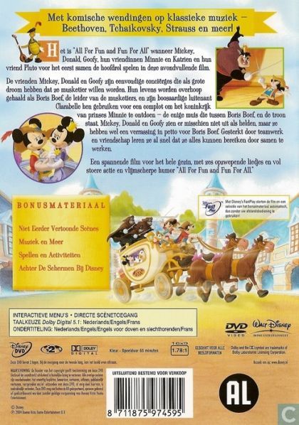 In Disney's take on the Alexander Dumas tale, Mickey Mouse, Donald Duck and Goofy want nothing more than to perform brave deeds on behalf of their queen (Minnie Mouse), but they're stymied by the head Musketeer, Pete. Pete secretly wants to get rid of the queen, so he appoints Mickey and his bumbling friends as guardians to Minnie, thinking such a maneuver will ensure his scheme's success. The score features songs based on familiar classical melodies.