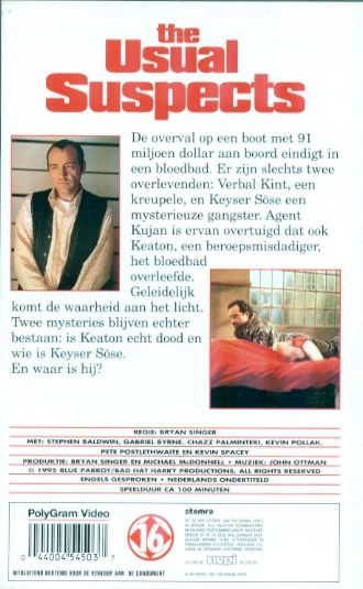 Held in an L.A. interrogation room, Verbal Kint attempts to convince the feds that a mythic crime lord, Keyser Soze, not only exists, but was also responsible for drawing him and his four partners into a multi-million dollar heist that ended with an explosion in San Pedro harbor – leaving few survivors. Verbal lures his interrogators with an incredible story of the crime lord's almost supernatural prowess.