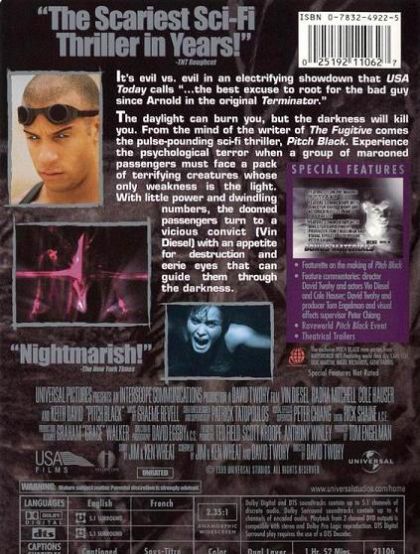When their ship crash-lands on a remote planet, the marooned passengers soon learn that escaped convict Riddick isn't the only thing they have to fear. Deadly creatures lurk in the shadows, waiting to attack in the dark, and the planet is rapidly plunging into the utter blackness of a total eclipse. With the body count rising, the doomed survivors are forced to turn to Riddick with his eerie eyes to guide them through the darkness to safety. With time running out, there's only one rule: Stay in the light.