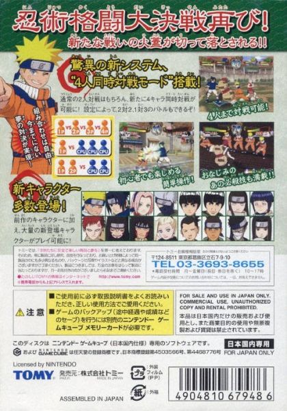 The hit series on Cartoon Network is back for more on Nintendo GameCube! NARUTO: Clash of Ninja 2 delivers non-stop ninja style combat action for 1-4 players where gamers choose to play as one of 23 playable characters. Naruto, Sasuke, Sakura and the other ninja-in training are going beyond the classroom now and must face each other and challenging new opponents in multi-ninja battles. All-new multi-player modes will engage players in frantic simultaneous four player battles and single-player modes will offer more gameplay choices than before with survival and timed attack modes that allow players to showcase their taijutsu and special jutsu abilities. When you're a ninja, you must be prepared for anything! Believe it!