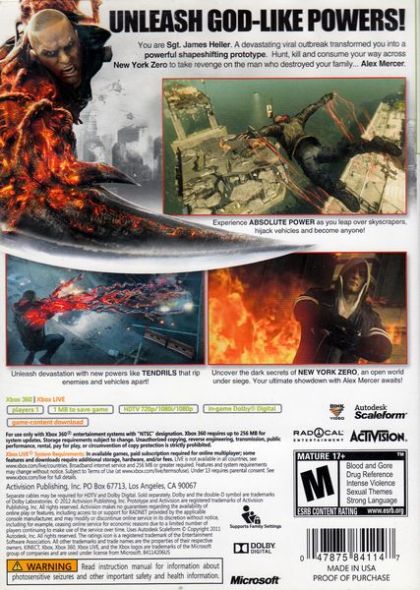 The sequel to Radical Entertainment's best-selling open-world action game of 2009, PROTOTYPE(r) 2 takes the unsurpassed carnage of the original PROTOTYPE and continues the experience of becoming the ultimate shape-shifting weapon. You are Sgt James Heller, husband to a deceased wife and child and a soldier left simply to die.