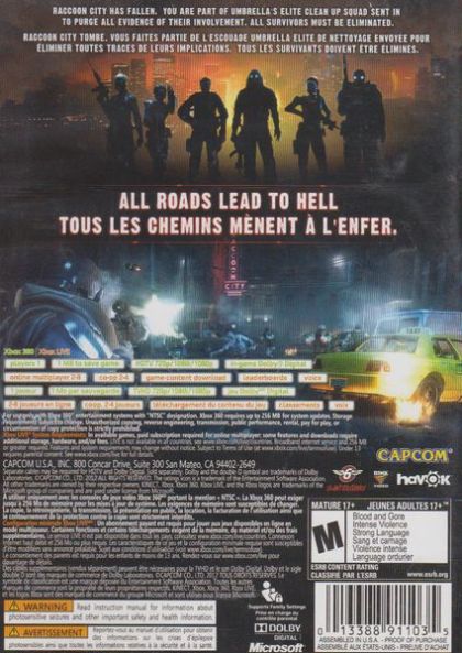Resident Evil: Operation Raccoon City delivers a true third person team based shooter experience set within the dark and sinister Resident Evil universe and a reinterpretation of the events depicted in Resident Evil 2 and Resident Evil 3. The setting of the Resident Evil universe not only provides a rich backdrop to the action but delivers a unique and thrilling triple threat battle. Zombies and Bio-Organic Weapons (B.O.W's) add to the mix as players not only compete against an opposing squad but also tackle this third unpredictable element, creating a brand new style of gameplay and breaking the conventions of traditional team based shooters.