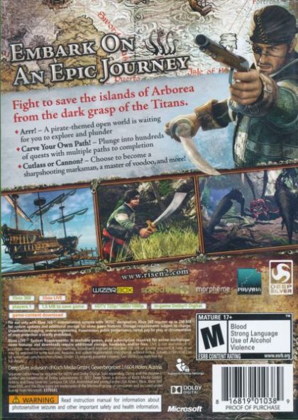 With an all-new pirate-based theme, Risen 2: Dark Waters aims to combine the most loved classic RPG gameplay mechanics of the original Risen with a fresh theme and setting on a huge variety of themed island locales. A third-person role-playing game set in a dark and gritty universe, Risen 2: Dark Waters maintains the most immersive features of the original Risen, withmultiple approaches to every challenge allowing players to shape the game world based on their own decisions. These choices will serve to unlock new paths, features and additional skills for the character. Together with a highly interactive environment and a full day/night-cycle affecting countless aspects of the game world, Risen 2 will be set in the most immersive RPG game world so far.