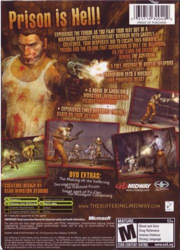 Jailed for a murder he may or may not have committed, Torque is next in line for execution when apparitions besiege the prison and inadvertently free him. Utilizing more than ten deadly weapons, Torque sets out to uncover his past and unlock the deadly secrets of The Suffering. In the game, players can transform Torque into his monstrous alter ego and unleash the power of his primal fury while battling 12 horrific creatures. Depending on how they play the game, players will arrive at three distinct endings for a unique gaming experience.