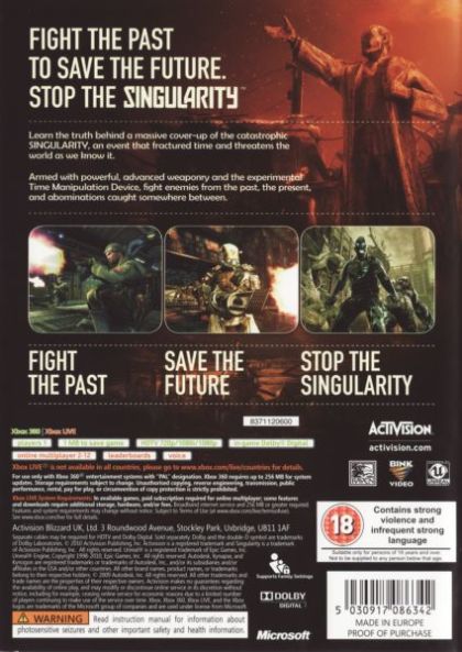 Singularity, the new first-person action game from Raven Software pits shooter and sci-fi fans against a devastating fracture in time. As players attempt to unravel a conspiracy, they must fight their way through an ever-shifting environment, haunted with time-ravaged creatures and mysteries, while sudden time waves hurl them back and forth between 1950 and the present day. Use wits and the perfect weapon for the job - the Time Manipulation Device (TMD) - to unravel the conspiracy behind this timeline calamity and prevent its catastrophic spread.