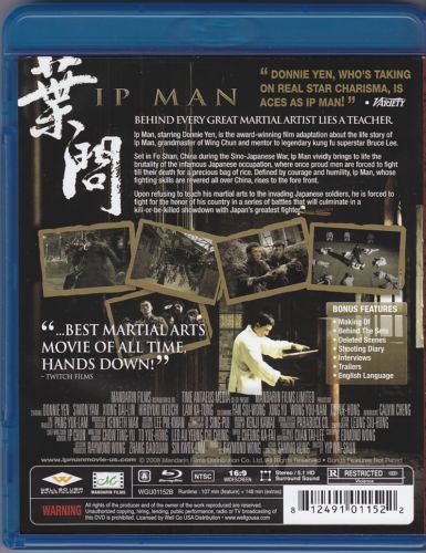 A semi-biographical account of Yip Man, the first martial arts master to teach the Chinese martial art of Wing Chun. The film focuses on events surrounding Ip that took place in the city of Foshan between the 1930s to 1940s during the Second Sino-Japanese War. Directed by Wilson Yip, the film stars Donnie Yen in the lead role, and features fight choreography by Sammo Hung.