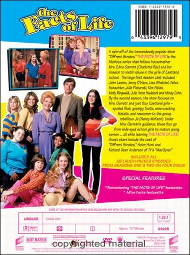 Before Degrassi Junior High and Seventh Heaven, there was The Facts of Life--a feel-good sitcom where a lesson was learned at the end of each episode. Set in an all-girl boarding school, the series spanned nine seasons, countless hairdos, and an array of cast members and guest stars--some of whom (George Clooney, Helen Hunt, Molly Ringwald) would become very, very famous in the future. But in the 29 episodes that cover the first two seasons, the series introduces TV viewers to characters that represent girls everyone knows--Blair, the rich, spoiled girl; Natalie, the chubby smart aleck; Jo, the rebellious tomboy; and Tootie, the rollerskating tattletale.