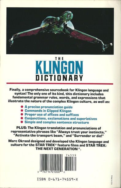 The official guide to Klingon/English words and phrases!The classic comprehensive Star Trek sourcebook for Klingon language and syntax! The only book of its kind, this dictionary includes the fundamental grammar rules, words, and expressions that illustrate the nature of the complex Klingon culture as well as: *A precise pronunciation guide *Commands in Clipped Klingon *Proper use of affixes and suffixes *Conjunctions, exclamations, and superlatives *Simple and complex sentence structure PLUS: a small phrasebook with Klingon translations for essential expressions such as "Activate the transport beam," "Always trust your instincts," and the ever-popular "Surrender or die!" Qapla’!