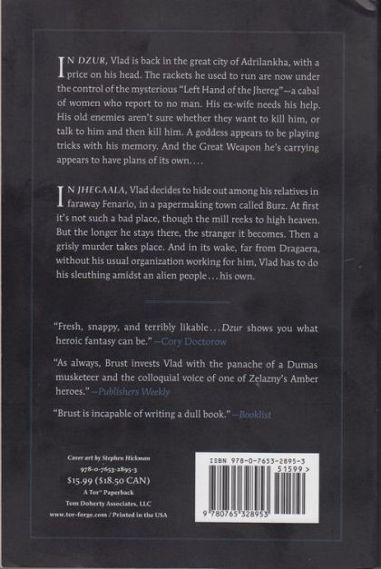 The first seven of Steven Brust's Vlad Taltos novels have long been in print from Ace Books in a set of three trade paperback omnibuses. Tor released the next two Vlad books, Dragon and Issola, into print as a trade paperback entitled The Book of Dragon. Now we continue with the next two, collecting the New York Times-bestselling Dzur and Jhegaala into The Book of Dzur.In Dzur, Vlad is back in the great city of Adrilankha, with a price on his head. The rackets he used to run are now under the control of the mysterious "Left Hand of the Jhereg"—a cabal of women who report to no man. His ex-wife needs his help. His old enemies aren't sure whether they want to kill him, or talk to him and then kill him. A goddess appears to be playing tricks with his memory. And the Great Weapon he's carrying appears to have plans of its own....In Jhegaala, Vlad decides to hide out among his relatives in faraway Fenario, in a papermaking town called Burz. At first it's not such a bad place, though the mill reeks to high heaven. But the longer he stays there, the stranger it becomes. Then a grisly murder takes place. And in its wake, far from Dragaera, without his usual organization working for him, Vlad has to do his sleuthing amidst an alien people...his own.