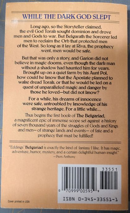"Eddings's Belgariad is exactly the kind of fantasy I like. It has magic, adventure, humor, mystery, and a certain delightful human insight."--Piers Anthony Long ago, so the Storyteller claimed, the evil God Torak sought dominion and drove men and Gods to war. But Belgarath the Sorcerer led men to reclaim the Orb that protected men of the West. So long as it lay at Riva, the prophecy went, men would be safe. But that was only a story, and Garion did not believe in magic dooms, even though the dark man without a shadow had haunted him for years. Brought up on a quiet farm by his Aunt Pol, how could he know that the Apostate planned to wake dread Torak, or that he would be led on a quest of unparalleled magic and danger by those he loved--but did not know? For a while, his dreams of innocence were safe, untroubled by knowledge of his strange heritage. For a little while . . . Thus begins the first book of The Belgariad, a magnificent epic of immense scope, set against a history of seven thousand years, of the struggles of Gods and Kings and men--of strange lands and events--of fate and a prophecy that must be fulfilled!