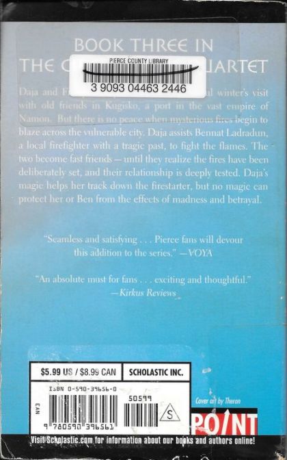 Part of the 8-book Tamora Pierce reissue for Fall 2006, this title in the Circle Opens quartet features spellbinding new cover art. Coincides with the release of WILL OF THE EMPRESS in trade pb.Daja and Frostpine expect to have a peaceful winter's visit with old friends in Kugisko, a port in the vast empire of Namon. But there is no peace when mysterious fires begin to blaze across the vulnerable city. Daja assists Bennat Ladradun, a local firefighter with a tragic past, to fight the flames. The two become fast friends-until they realize the fires have been deliberately set, and their relationship is deeply tested. Daja's magic helps her track down the firestarter, but no magic can protect her or Ben from the effects of madness and betrayal.