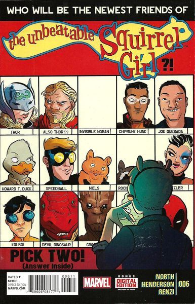 - The start of a new arc! Squirrel Girl meets some potential new allies, including... GIRL SQUIRREL?? - I don't know why we put question marks there; it's actually what happens! - Also a hippo named 'Hippo' is in this issue! This character already existed and we absolutely did NOT make him up at the last minute! - ALSO THERE'S FIGHTS!! AND EVEN SOME FEELINGS! Rated T