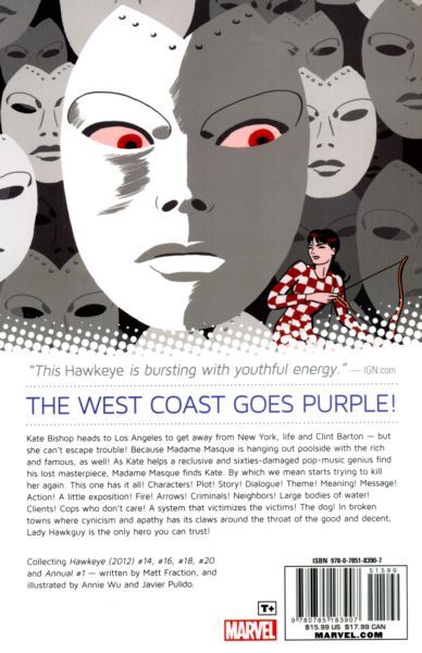 Kate Bishop heads to Los Angeles to get away from New York, life and Clint Barton - but she can't escape trouble! Because Madame Masque is hanging out poolside with the rich and famous, as well! As Kate helps a reclusive and sixties-damaged pop-music genius find his lost masterpiece, Madame Masque finds Kate. By which we mean starts trying to kill her again. This one has it all! Characters! Plot! Story! Dialogue! Theme! Meaning! Message! Action! A little exposition! Fire! Arrows! Criminals! Neighbors! Large bodies of water! Clients! Cops who don't care! A system that victimizes the victims! The dog! In a broken town where cynicism and apathy has its claws around the throat of the good and decent, Lady Hawkguy is the only hero you can trust! Collecting HAWKEYE (2012) #14, #16, 18, #20 and ANNUAL #1.