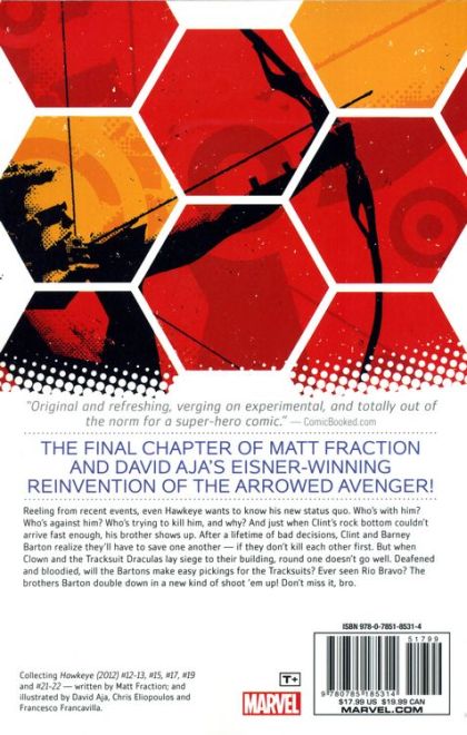 Reeling from recent events, even Hawkeye wants to know his new status quo. Who's with him? Who's against him? Who's trying to kill him, and why? And just when Clint's rock bottom couldn't arrive fast enough, his brother shows up. After a lifetime of bad decisions, Clint and Barney Barton have to realize that they are brothers - and, ultimately, they're the only ones who can save one another. If they don't kill each other first. Now, the brothers Barton double down as the Clown and the Tracksuit Draculas lay siege to their building. Can Hawkguy keep everyone safe? Deafened and bloodied, will the Bartons make easy pickings for the Tracksuits? Ever seen Rio Bravo? It's the final chapter of Matt Fraction and David Aja's critically acclaimed reinvention of the arrowed Avenger! Don't miss it, bro. Collecting HAWKEYE (2012) #17, #12-13, #15, #19 and #21-22. Rated T+
