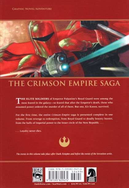 The blood-soaked tale of the last surviving member of Emperor Palpatine's Royal Guard is now complete in one dust-jacketed hardcover edition! From revenge to redemption, the story of Kir Kanos takes him from the deserts of Yinchorr, to the halls of Imperial power, and to the inner circle of the New Republic. Included are encounters with Darth Vader, Boba Fett, Luke Skywalker, and Leia Organa Solo. An epic tale in one epic tome!