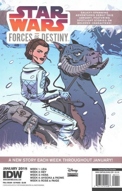 The Star Wars Forces of Destiny initiative celebrates the inspiring stories of iconic heroes from a galaxy far, far away.... Star Wars Adventures has joined the festivities with an exciting weekly series of comic books that explores all corners of the Star Wars universe, showing how choices both big and small ultimately shape the destinies of beloved characters, such as Princess Leia, Rey, Padme, Ahsoka, and Hera along with your soon-to-be favorites from The Last Jedi, Rose and Paige! Fans will be excited to discover these stories told by talent from across Star Wars novels, comics and animation, including Delilah S. Dawson, Elsa Charretier, Beth Revis, Jody Houser, and Devin Grayson! • Each issue has a variant cover by Elsa Charretier! Collect all five! • Featuring your favorite classic Star Wars characters and a couple of brand new favorites!