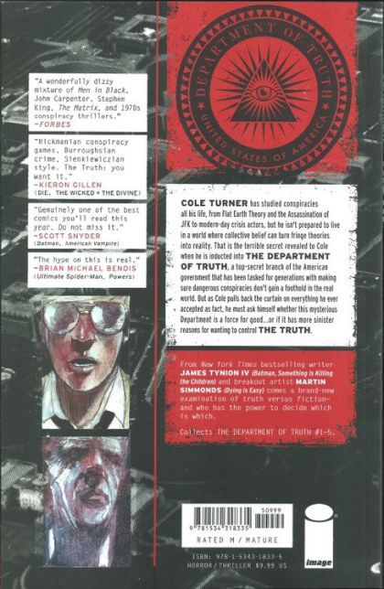COLE TURNER has studied conspiracy theories all his life, but he isn't prepared for what happens when he discovers that all of them are true, from the JFK Assassination to Flat Earth Theory and Reptilian Shapeshifters. One organization has been covering them up for generations. What is the deep, dark secret behind the Department of Truth? From bestselling writer JAMES TYNION IV (Batman, Something is Killing the Children) and breakout artist MARTIN SIMMONDS (Dying is Easy)!