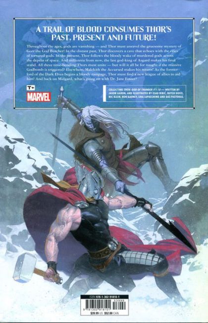 A trail of blood consumes Thor's past, present and future! Throughout the ages, gods are vanishing - and Thor must unravel the gruesome mystery of Gorr the God Butcher! In the distant past, Thor discovers a cave that echoes with the cries of tortured gods. In the present, Thor follows the bloody wake of murdered gods across the depths of space. And millennia from now, the last god-king of Asgard makes his final stand. All three time-bending Thors must unite - but will it all be for naught if the massive Godbomb is triggered? Elsewhere, Malekith the Accursed makes his return! As the former lord of the Dark Elves begins a bloody rampage, Thor must find a new league of allies to aid him! And back on Midgard, what's going on with Dr. Jane Foster? Collecting THOR: GOD OF THUNDER #1-18. Rated T+