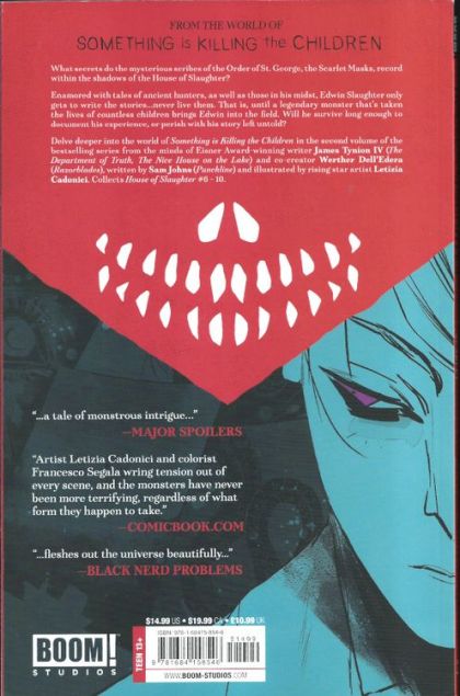 What secrets do the mysterious scribes of the Order of St. George, the Scarlet Masks, record within the shadows of the House of Slaughter? Enamored with stories of ancient hunters, as well as those in his midst, Edwin Slaughter only gets to write the stories never live them. That is, until a legendary monster that's taken the lives of countless children brings Edwin into the field. Will he live to survive long enough to document his experience, or perish with his story left untold? Delve deeper still into the world of Something is Killing the Children in the second volume of the bestselling series written by co-creator and award-winning author James Tynion IV (The Department Of Truth, The Nice House On The Lake) and co-writer Sam Johns (Punchline) alongside rising star artist Latizia Cadonici and co-creator Werther Dell'Edera (Razorblades). Collects House of Slaughter #6-10.