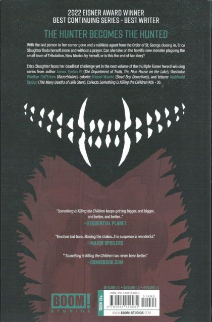 With the last person in her corner gone and a ruthless Order of St. George agent closing in, Erica Slaughter finds herself alone and without a prayer. Can she take on this horrific new monster plaguing the small town of Tribulation, New Mexico by herself, or is this the end of her story? Erica is also faced with a choice to reach out to an unexpected source for help, or find herself dealing with both a monster and her human enemies alone... Erica Slaughter faces her deadliest challenge yet in the next volume of the Eisner & Ringo Award-winning and Harvey Award-nominated series from GLAAD Award-winning author James Tynion IV (Department of Truth, The Nice House on the Lake), artist Werther Dell'Edera (Razorblades), colorist Miquel Muerto (Radiant Red), and letterer AndWorld Design (Nightwing, The Many Deaths of Laila Starr). Collects Something is Killing the Children #26-30.