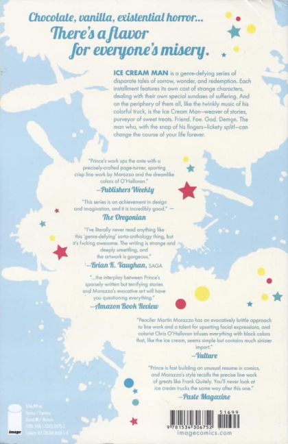 Chocolate, vanilla, existential horror, addiction, musical fantasy... there's a flavor for everyone's misery. ICE CREAM MAN is a genre-defying comic book series, featuring disparate "one-shot" tales of sorrow, wonder, and redemption. Each installment features its own cast of strange characters, dealing with their own special sundae of suffering. And on the periphery of all of them, like the twinkly music of his colorful truck, is the Ice Cream Man?a weaver of stories, a purveyor of sweet treats. Friend. Foe. God. Demon. The man who with a snap of his fingers?lickety split!?can change the course of your life forever. Written by W. MAXWELL PRINCE (ONE WEEK IN THE LIBRARY), with art by MART N MORAZZO (SNOWFALL, GREAT PACIFIC). Collects issues 1-4.